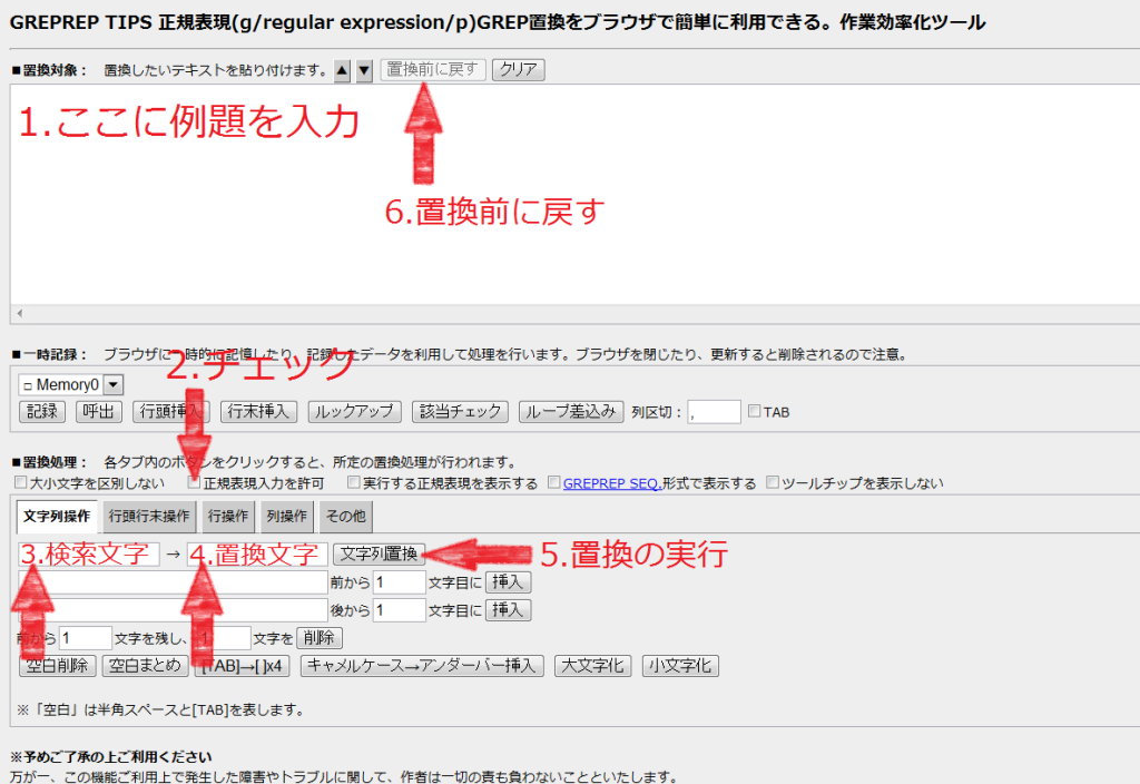1に例題をコピペして、2の「正規表現入力を許可」を忘れずにチェックし、3に検索したい文字、4に置き換えたい文字を入力しましょう。「文字列置換」をクリックすると、1の場所で置換されます。