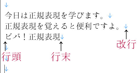 例) 今日は正規表現を学びます。 正規表現を覚えると便利ですよ。 ビバ!正規表現 検索文字:^正規表現 今日は正規表現を学びます。 正規表現を覚えると便利ですよ。 ビバ!正規表現