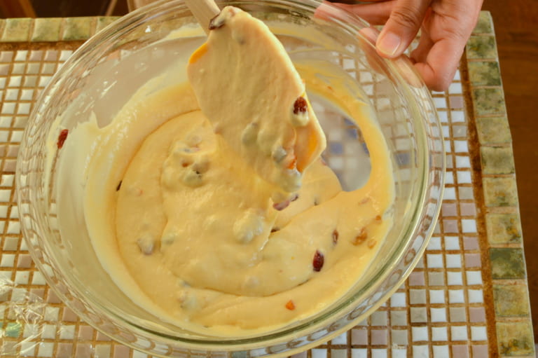 水気を適当に切ったドライフルーツを入れ、混ぜ合わせます(オレンジ・レモンの皮はこの段階では入れません)。生地はトロトロですが、問題ありません。