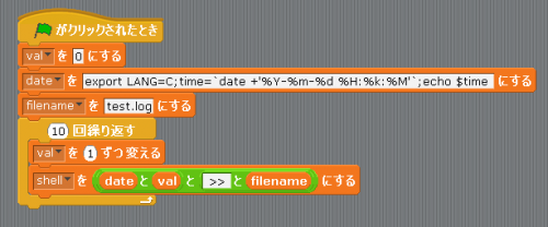 上を少しだけ応用して、現時刻の入ったログを保存。Pi_scratch等を使用してIoT的な何かを作ってログやCSVを残したいという時に使えるのではないかと。