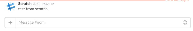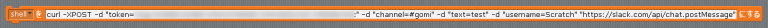 curl -XPOST -d "token=トークンをココへ" -d "channel=#general" -d "text=test from scratch" -d "username=Scratch" "https://slack.com/api/chat.postMessage"