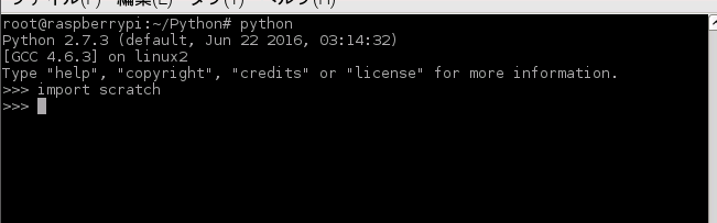 pythonを実行して、import scratch と打ってエラーが出なければOK(Ctrl+Dで終了)。