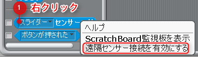 Scratch1.4の遠隔センサー接続を有効にします(1.4以外では使えません)。「調べる→スライダーセンサーの値→右クリック→遠隔センサー接続を有効にする」を押します。